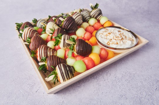 Skewered Fresh Fruit finished with a Chocolate Covered Strawberry served with Cinnamon Vanilla Yogurt - 2 skewers per guest